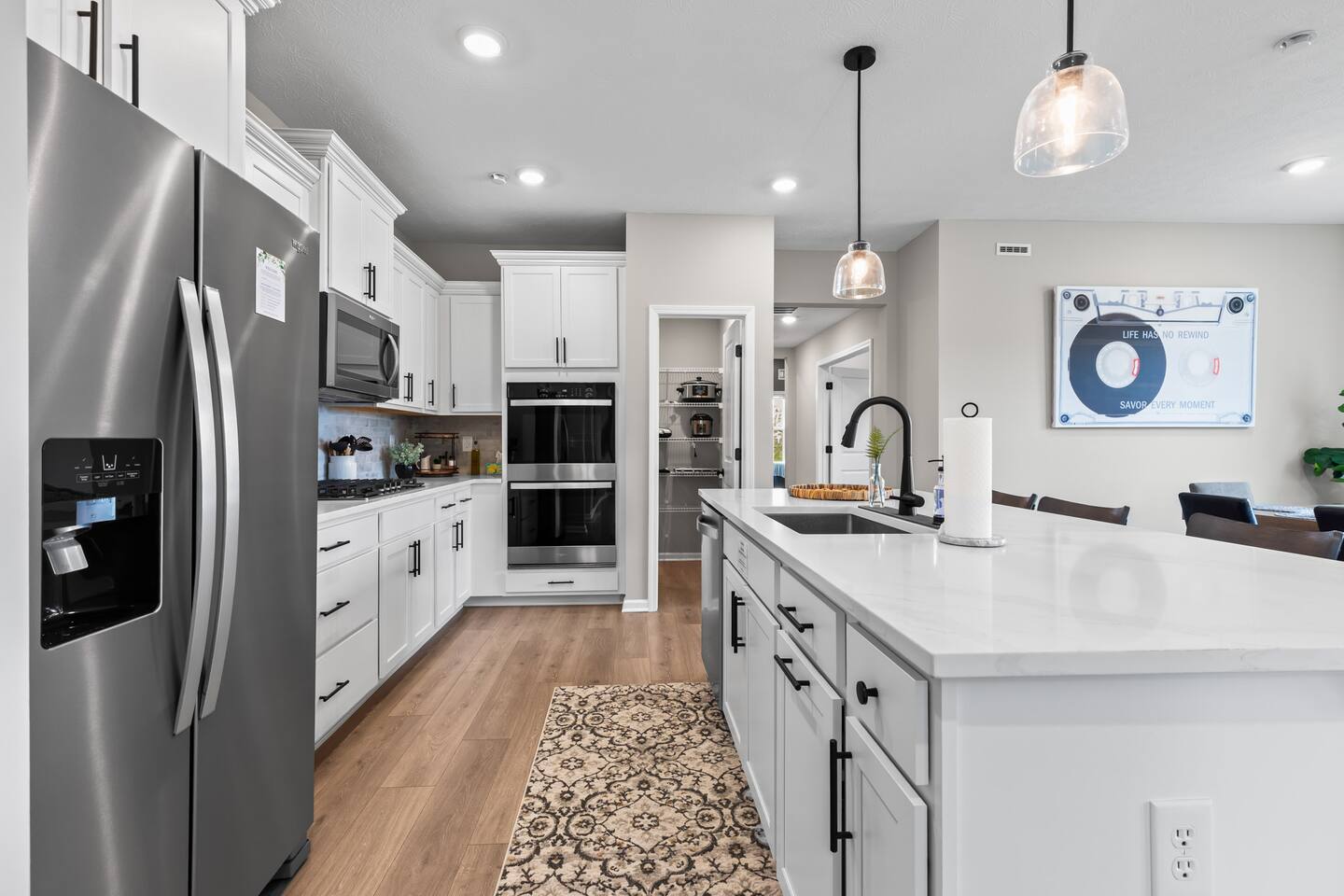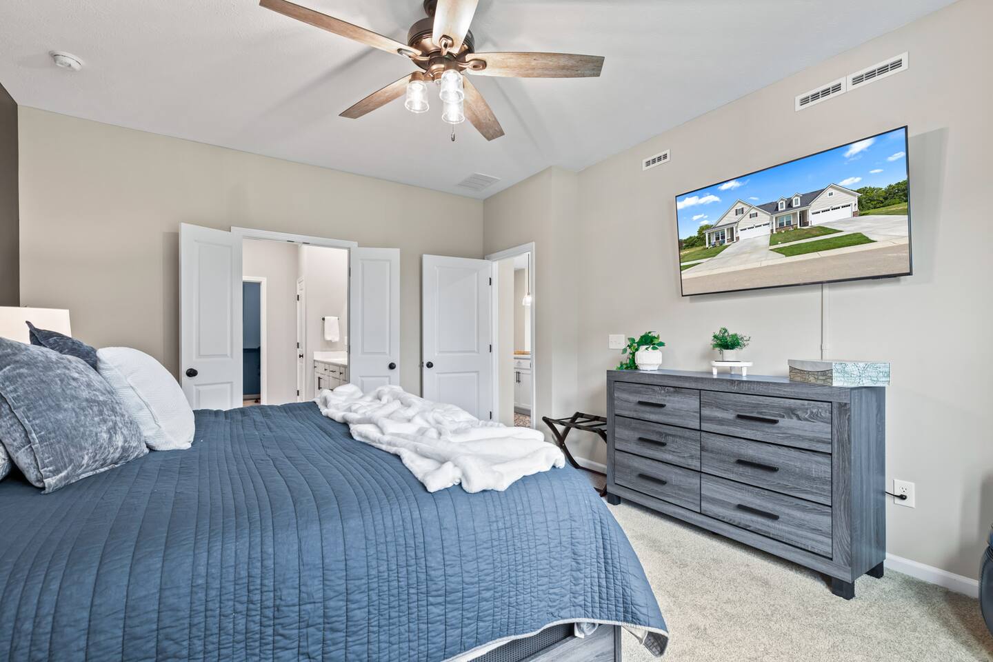 BRAND NEW luxury RANCH paired home ACROSS THE STREET from Grand Park, 35 mins from downtown Indy, very close to all the things! This ENERGY STAR certified and Indoor airPLUS qualified home, you and your loved ones can breathe fresher, cleaner air in your home thanks to the installed double-filtered ventilation system (ERV) that reduces pollutants and allergens. Complete, full chefs kitchen, 65" 4K UHD Smart TV in living room and Smart TV's and CEILING FANS in ALL bedrooms, electric fireplace, 9 ft ceilings, & 2 patios! Master Bedroom includes private office! SLEEPS 8, ample parking.